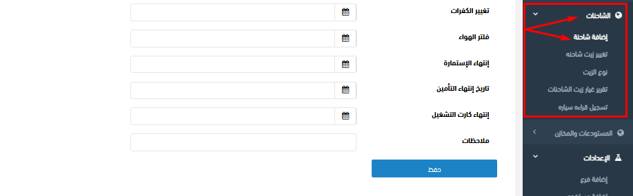فمن القائمة الجانبية يمين الشاشة، اختر “الشاحنات” ثم “إضافة شاحنة جديدة، وبها ستقوم بتسجيل البيانات الواردة أعلاه الخاصة برقم السيارة والقراءة الحالية وغطاس الهواس وغيرها من البيانات.